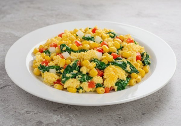 Tres huevos revueltos con granos de elote, espinaca, cebolla y un toque de pimiento rojo.