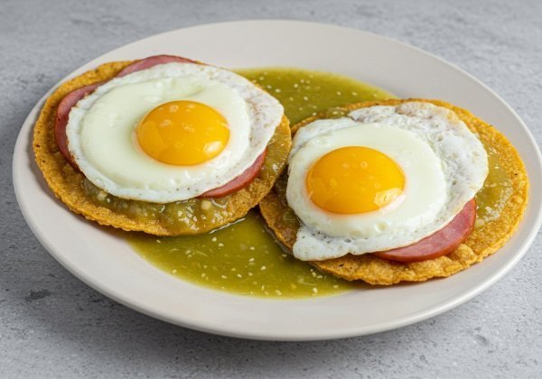 Huevos estrellados con su yema suave, jamón, cubiertos de salsa verde y montados sobre tortillas fritas doradas.