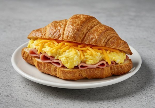 Pieza de croissant recién horneado con huevo revuelto queso cheddar derretido y jamón de cerdo.