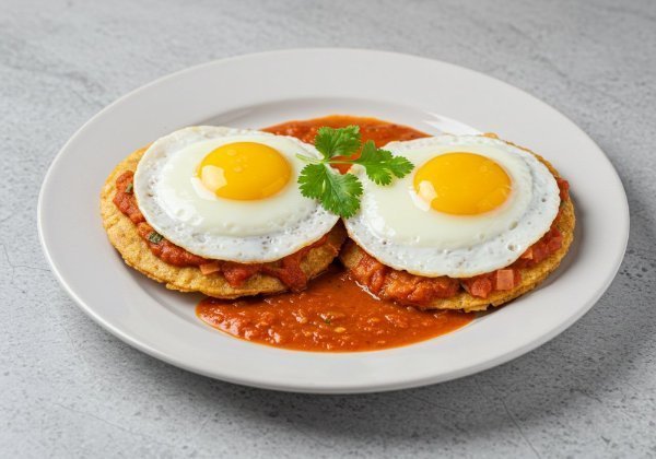 Huevos estrellados con su yema, cubiertos de salsa roja y montados sobre tortillas fritas doradas.