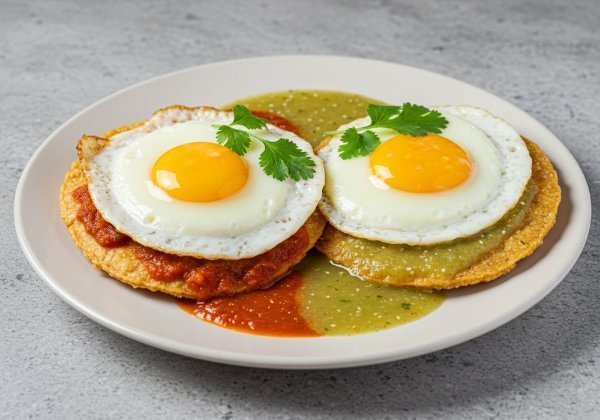 Huevos estrellados con su yema, cubiertos de salsa roja y verde, montados sobre tortillas fritas doradas.