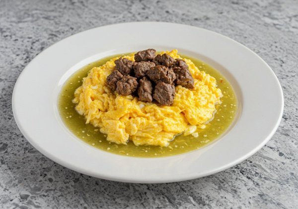 Tres huevos revueltos sobre una base de salsa verde, acompañados de jugosa arrachera a la parrilla.