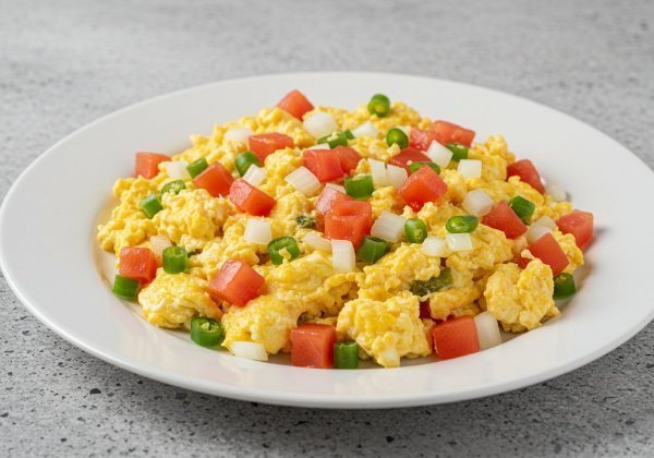Tres huevos revueltos con cebolla, chile serrano y jitomate jugoso, una combinación clásica y deliciosa para empezar el día con energía.