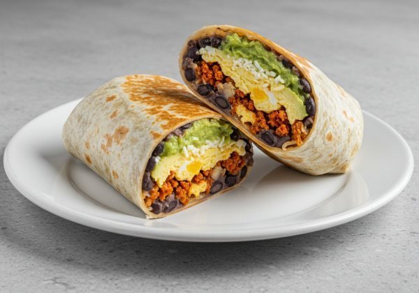 Deliciosos burrito relleno de huevo chorizo frijoles queso derretido y aguacate fresco.