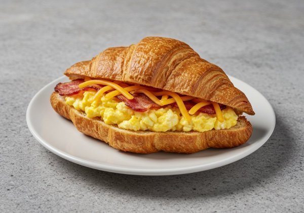 Pieza de croissant recién horneado con huevo revuelto queso cheddar derretido y crujiente tocino.