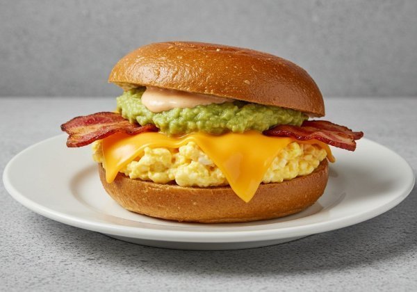 Sándwich en pan de papa con huevo revuelto, tocino, queso cheddar, guacamole y salsa de la casa.