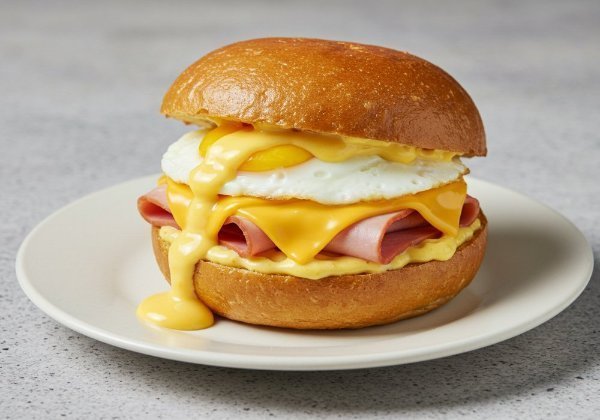 English muffin con huevo estrellado jamón de cerdo queso cheddar derretido y un toque de salsa holandesa. Un clásico lleno de sabor.