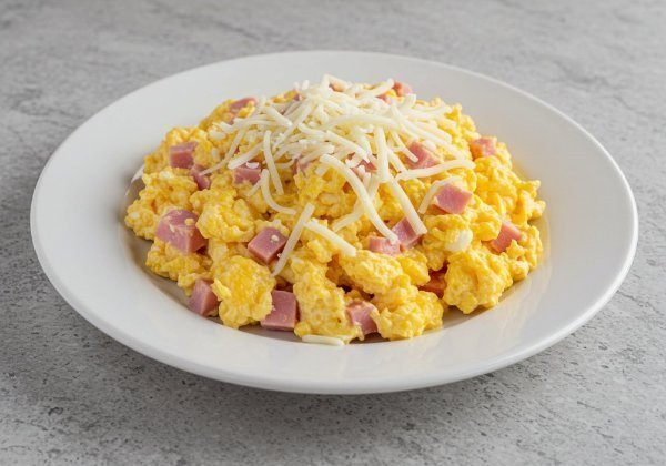Tres huevos revueltos con jamón y queso mozzarella una combinación clásica y deliciosa para empezar el día con energía.