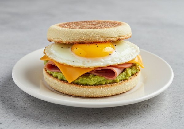 English muffin con jamón de pavo, huevo estrellado, aguacate fresco y queso cheddar derretido.