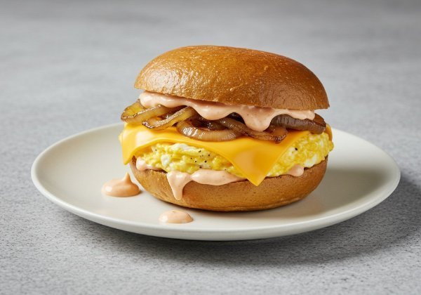 Sándwich en pan de papa con huevo revuelto, queso cheddar, cebolla asada y salsa de la casa.