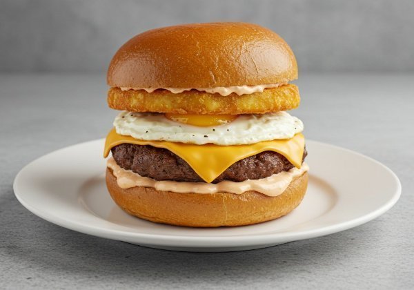 Sándwich en pan de papa con huevo estrellado, carne de hamburguesa, queso cheddar, hash brown y salsa Eggy.
