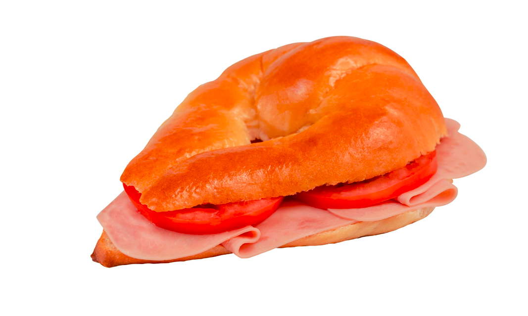 Cuernito con jamón de pierna, queso gouda, jitomate y aderezo de la casa.