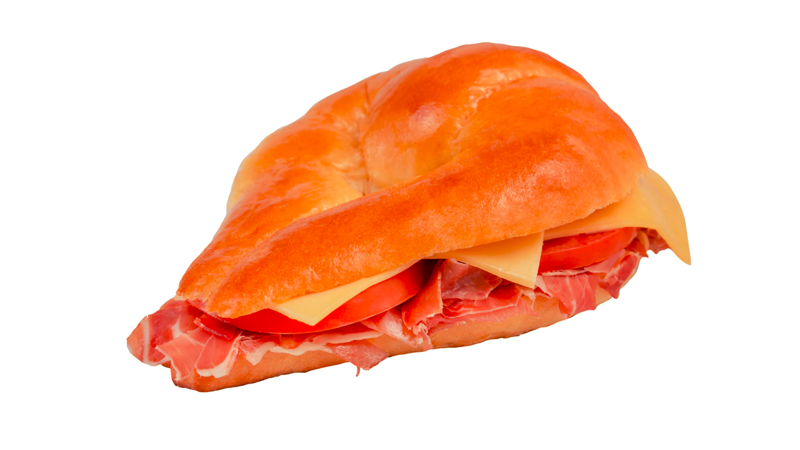 Cuernito con jamón serrano, queso gouda, jitomate y aderezos de la casa.