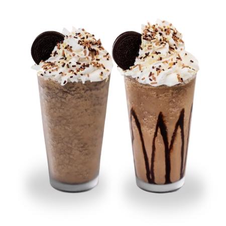 2 bebidas: mezcla de la casa para moka frío y Capuccino frio con galleta triturada. El tamaño y personalización aplica para ambas bebidas
