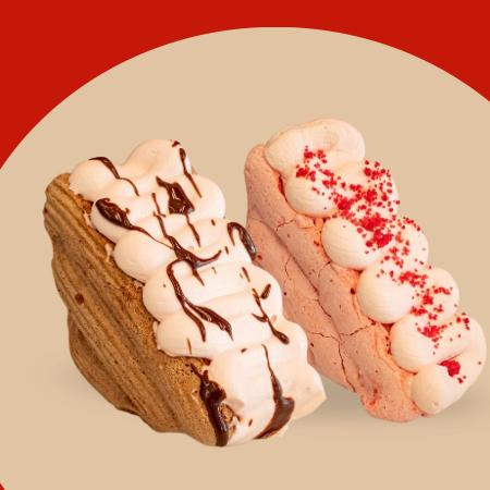 Crujiente merengue de chocolate cubierto con crema de vainilla y relleno de nuestro espectacular helado de fresa hecho en casa. (Sin Gluten) peso aproximado 145g