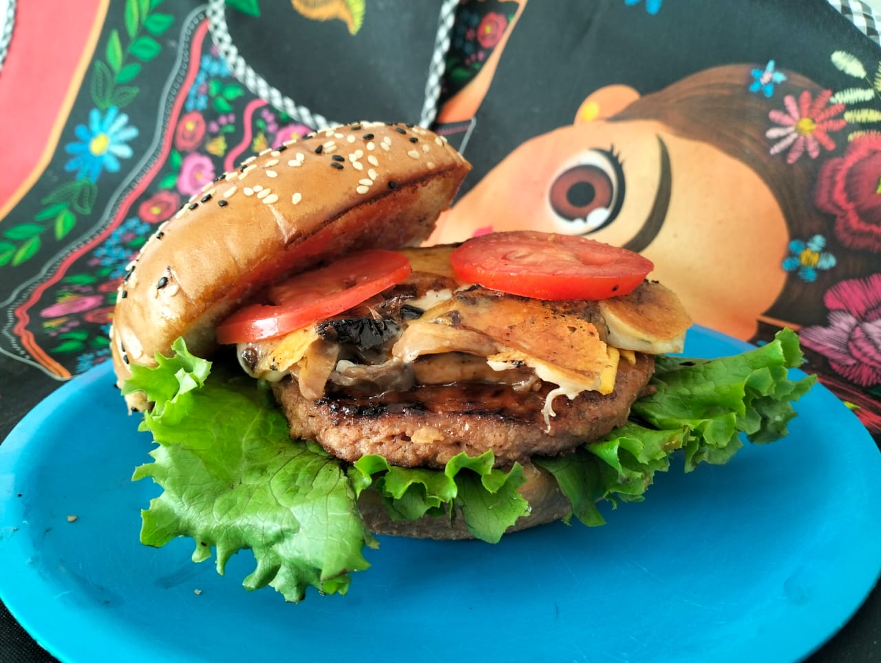 Pan, 150 g de carne, lechuga italiana, chiles jalapeños sazonados, cebolla caramelizada, jitomate, queso americano, mayonesa, cátsup, mostaza, queso mozzarella y champiñón.