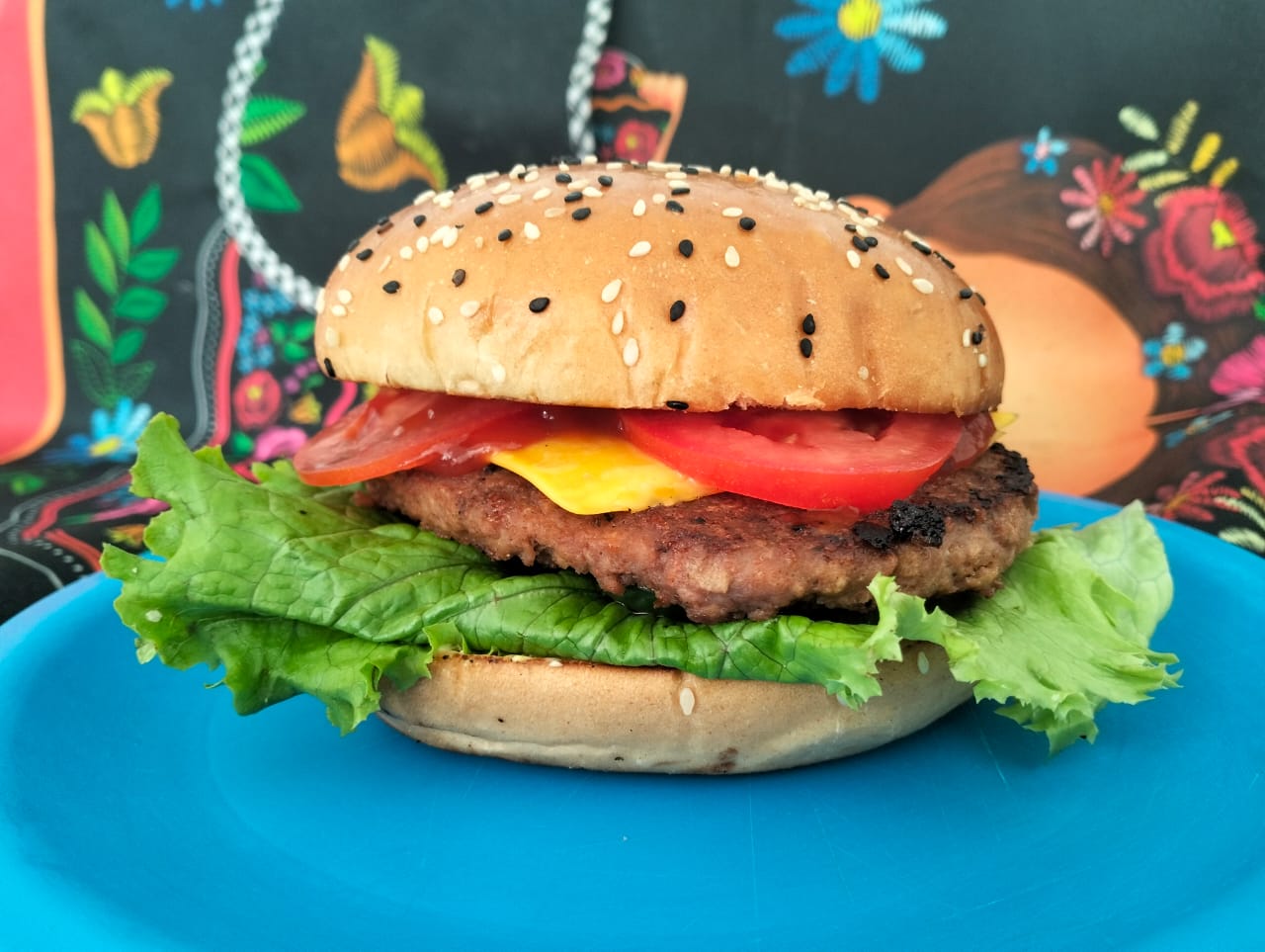 Pan, 150 g de carne, lechuga italiana, chiles jalapeños sazonados, cebolla caramelizada, jitomate, queso americano, mayonesa, cátsup y mostaza.