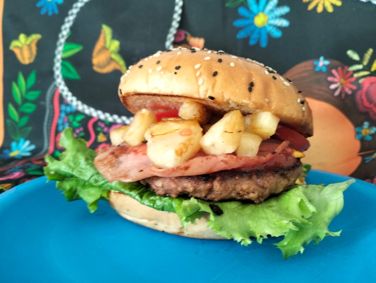 Pan, 150 g de carne, lechuga italiana, chiles jalapeños sazonados, cebolla caramelizada, jitomate, queso americano, mayonesa, cátsup, mostaza, jamón y piña.
