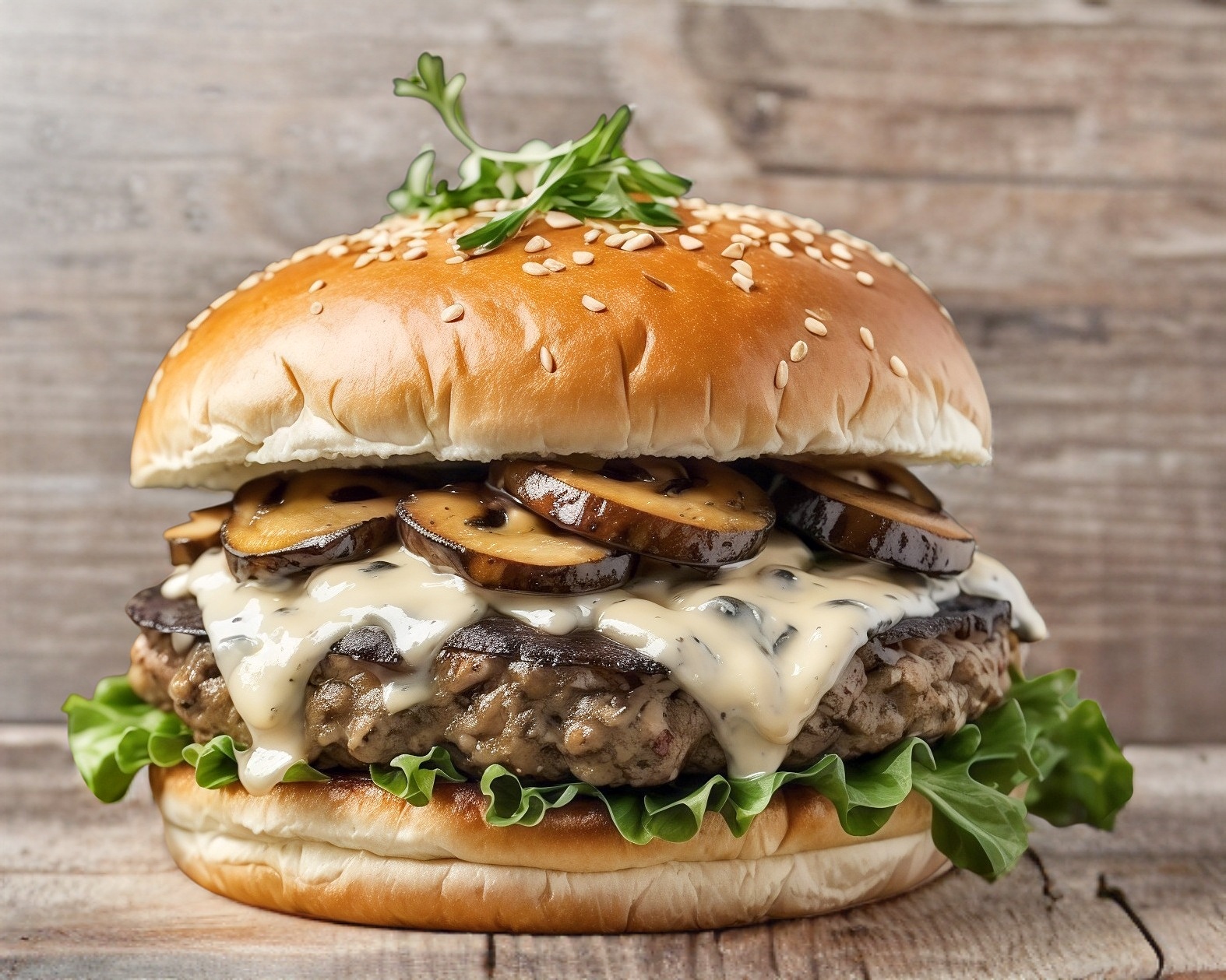 Pan, carne (150 gr), lechuga italiana, cebolla caramelizada, chiles sazonados, queso americano, jitomate, mayonesa, mostaza, catsup, mozarella y champignon.