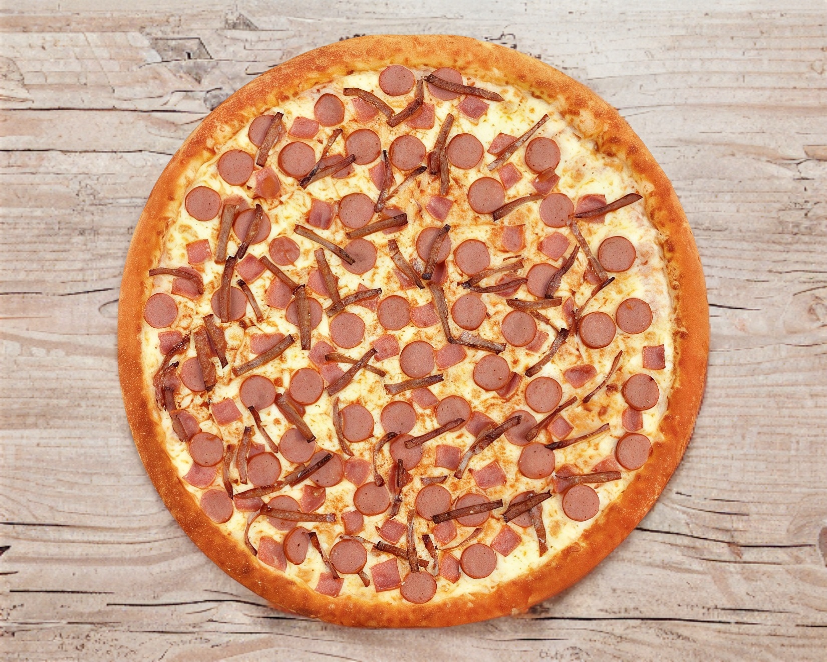 Masa de la casa, salsa de tomate, jamon, salchicha y chorizo.