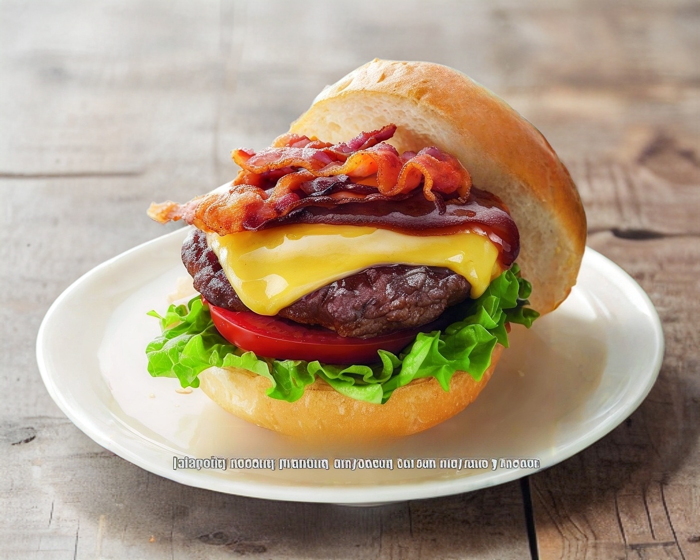 Pan, carne (150 gr), lechuga italiana, cebolla caramelizada, chiles sazonados, queso americano, jitomate, mayonesa, mostaza, catsup y tiras de tocino frito.