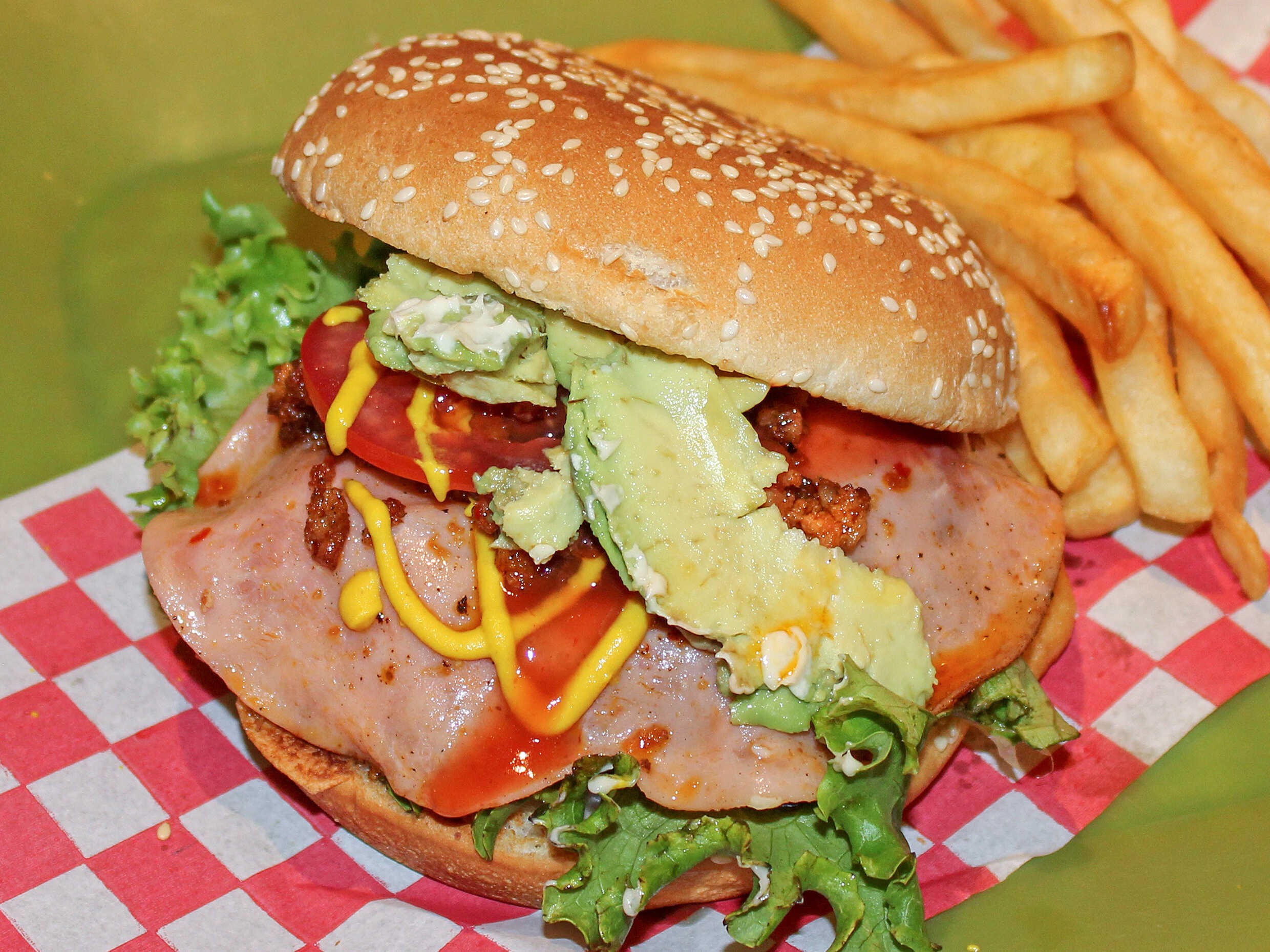 Carne, jamón, queso americano, lechuga, cebolla morada.
