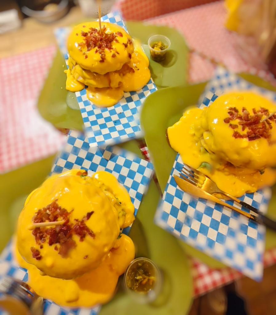 DOBLE CARNE, bañada en queso cheddar, trocitos de tocino, jamón, queso gouda y cebolla morada.