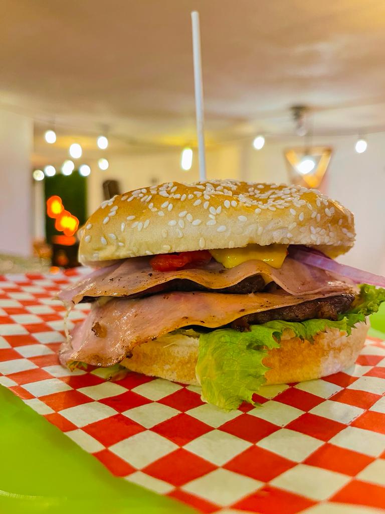 DOBLE CARNE, jamón, queso americano, queso gouda, cebolla morada.