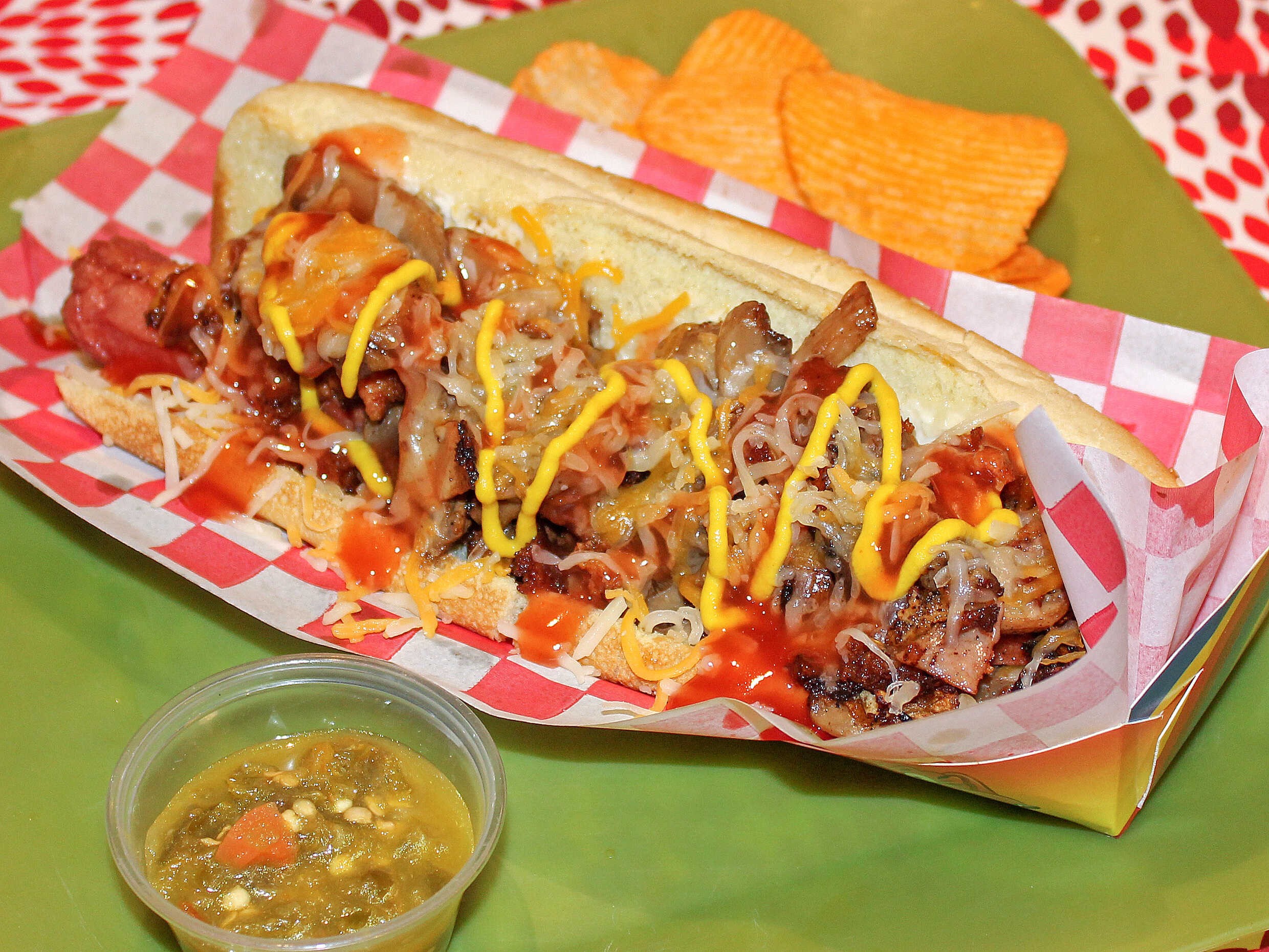 Salchicha de pavo, tocino, gratinado en queso gouda y chips.