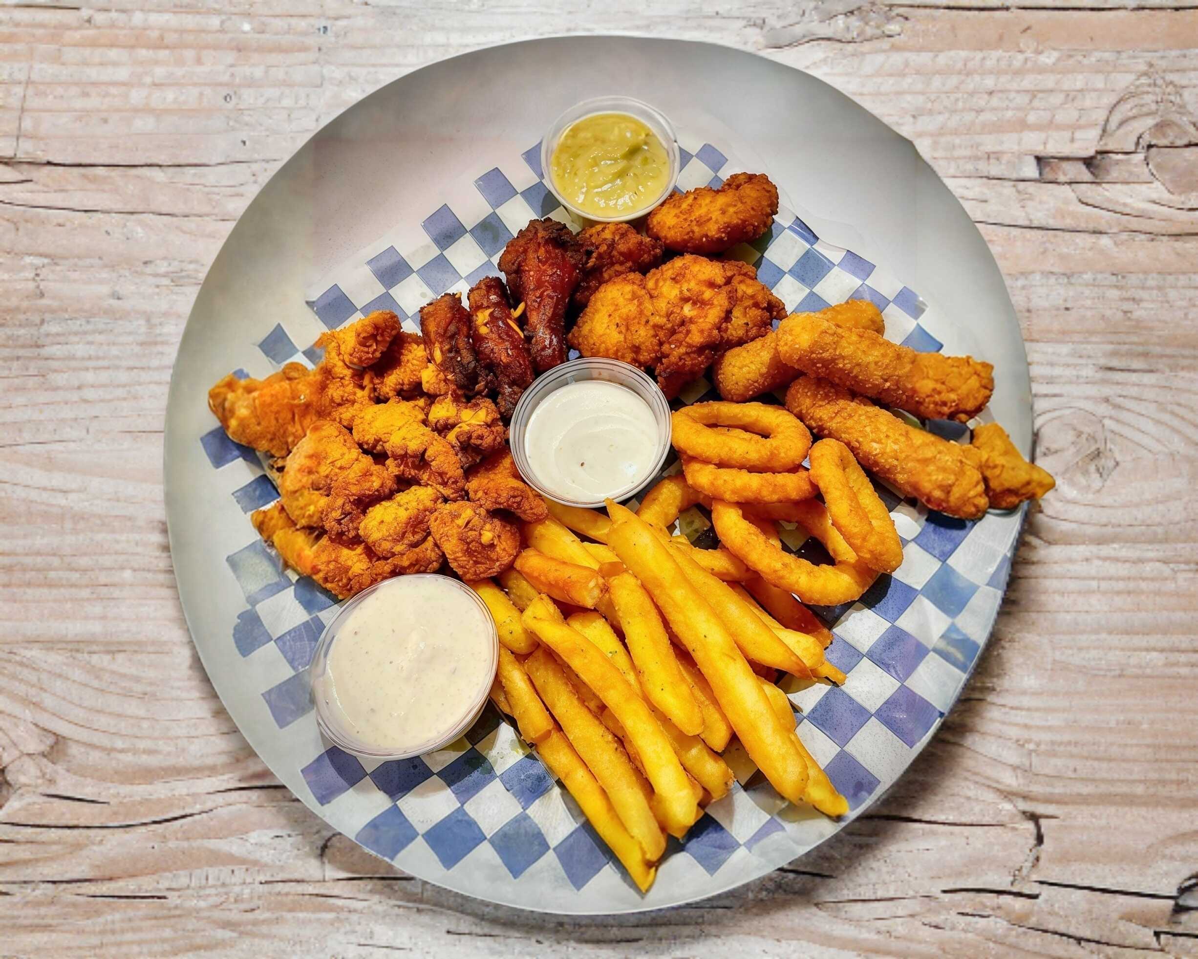 5 Alitas*1 + 4 Boneless*1 + Dedos de queso (5)*1 + Aros de Cebollas (6 pzas.)*1 + Palomitas de Pollo*1 + Malteada Chica*1