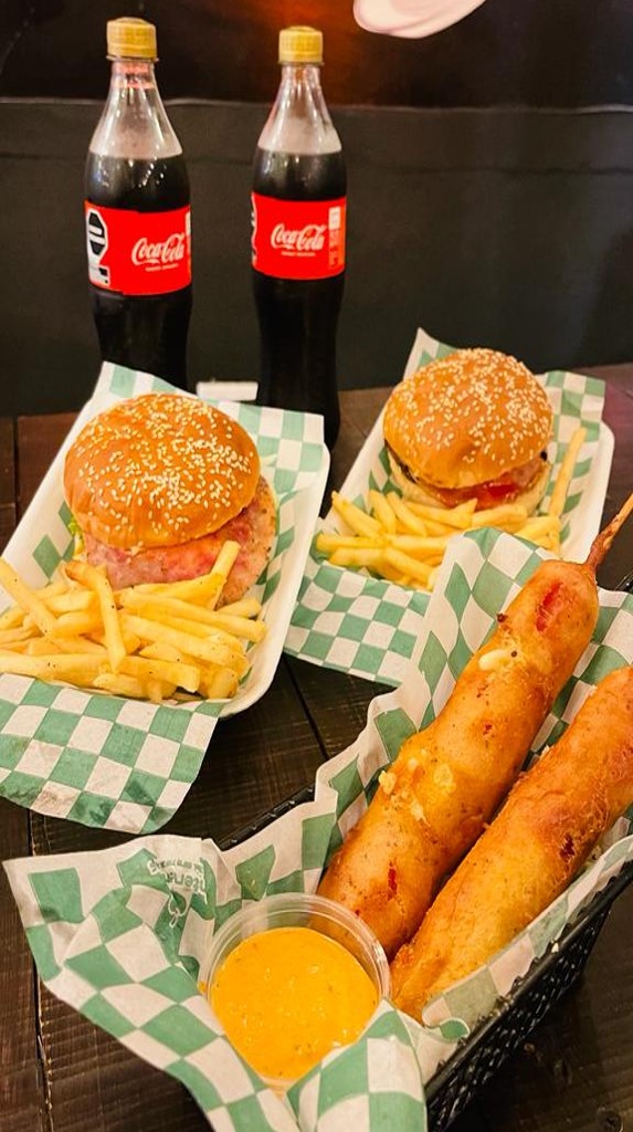 2 Hamburguesas Clásicas o 2 Hot dogs Clásicos, 1 orden de papas a la francesa o gajo, 2 banderillas y 2 Coca Cola 600ml o 1 malteada grande.