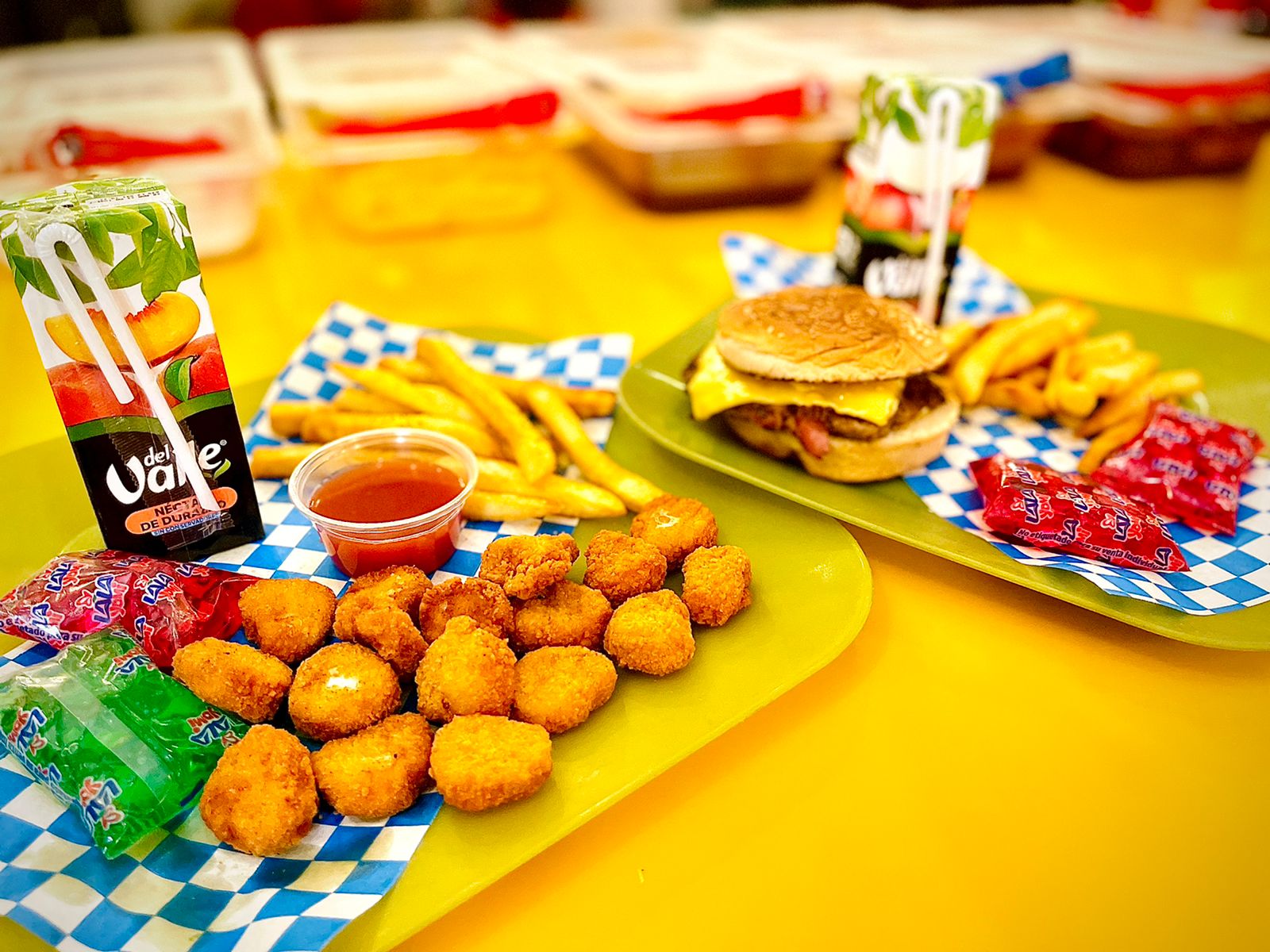 Hamburguesa pequeña o palomitas de pollo + papas + juguito + postrecito.