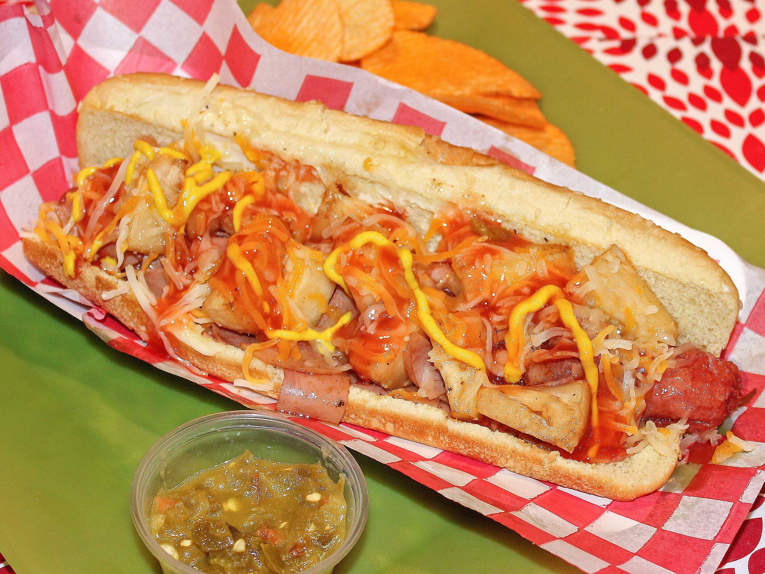 Salchicha de pavo, piña, jamón, tocino, gratinado en queso gouda y chips.