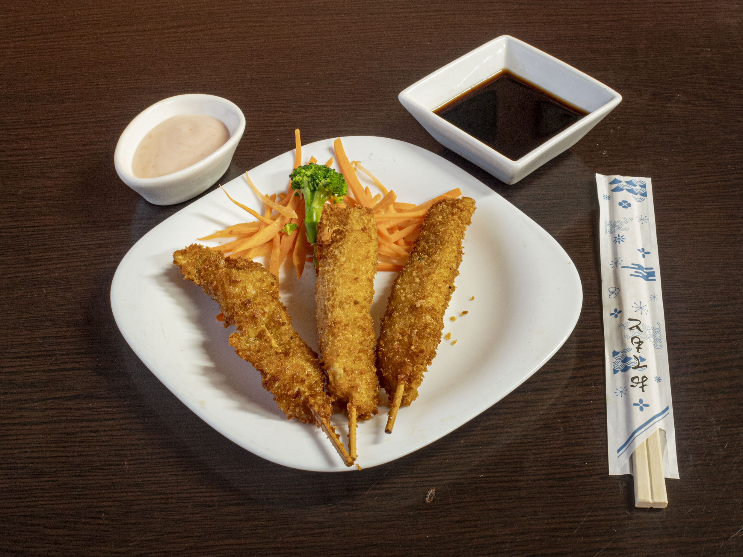 Tres brochetas de filete tilapia, empanizados y aderezo mil islas.