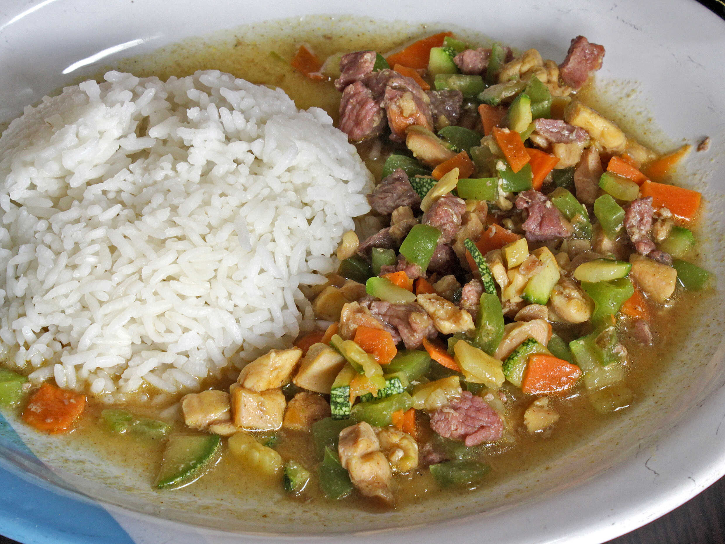 carne, pollo y verduras en salsa curry con arroz al vapor