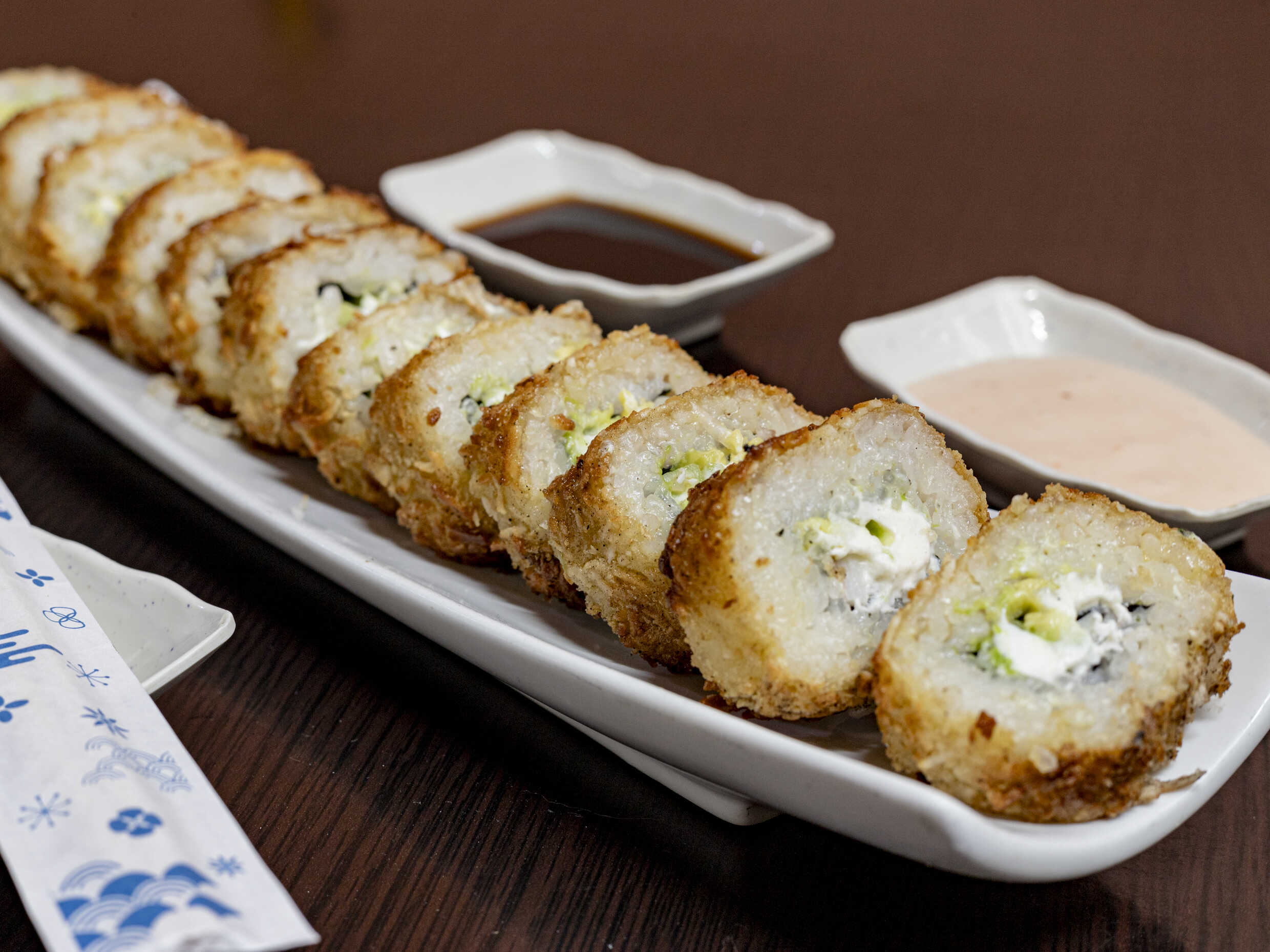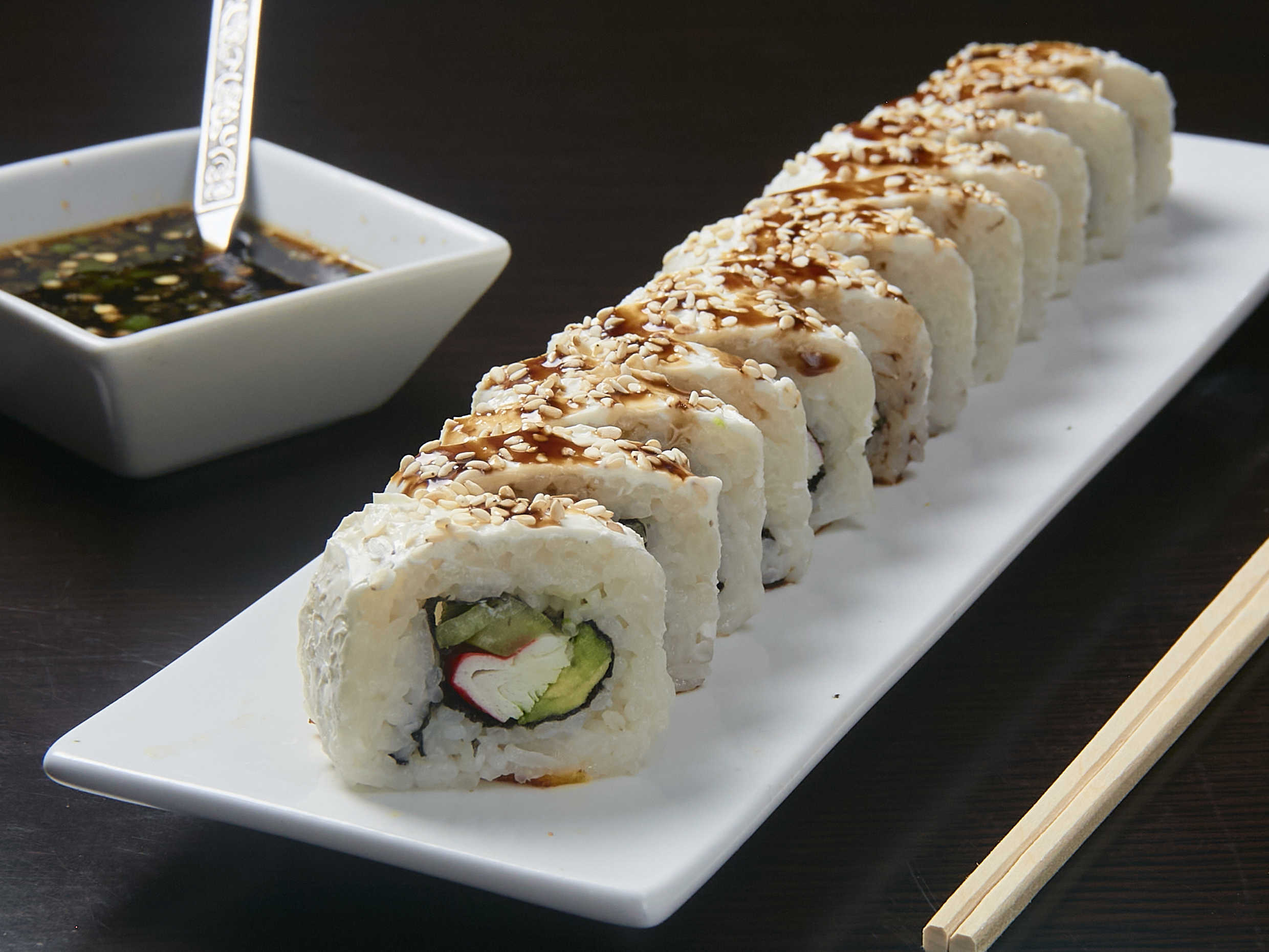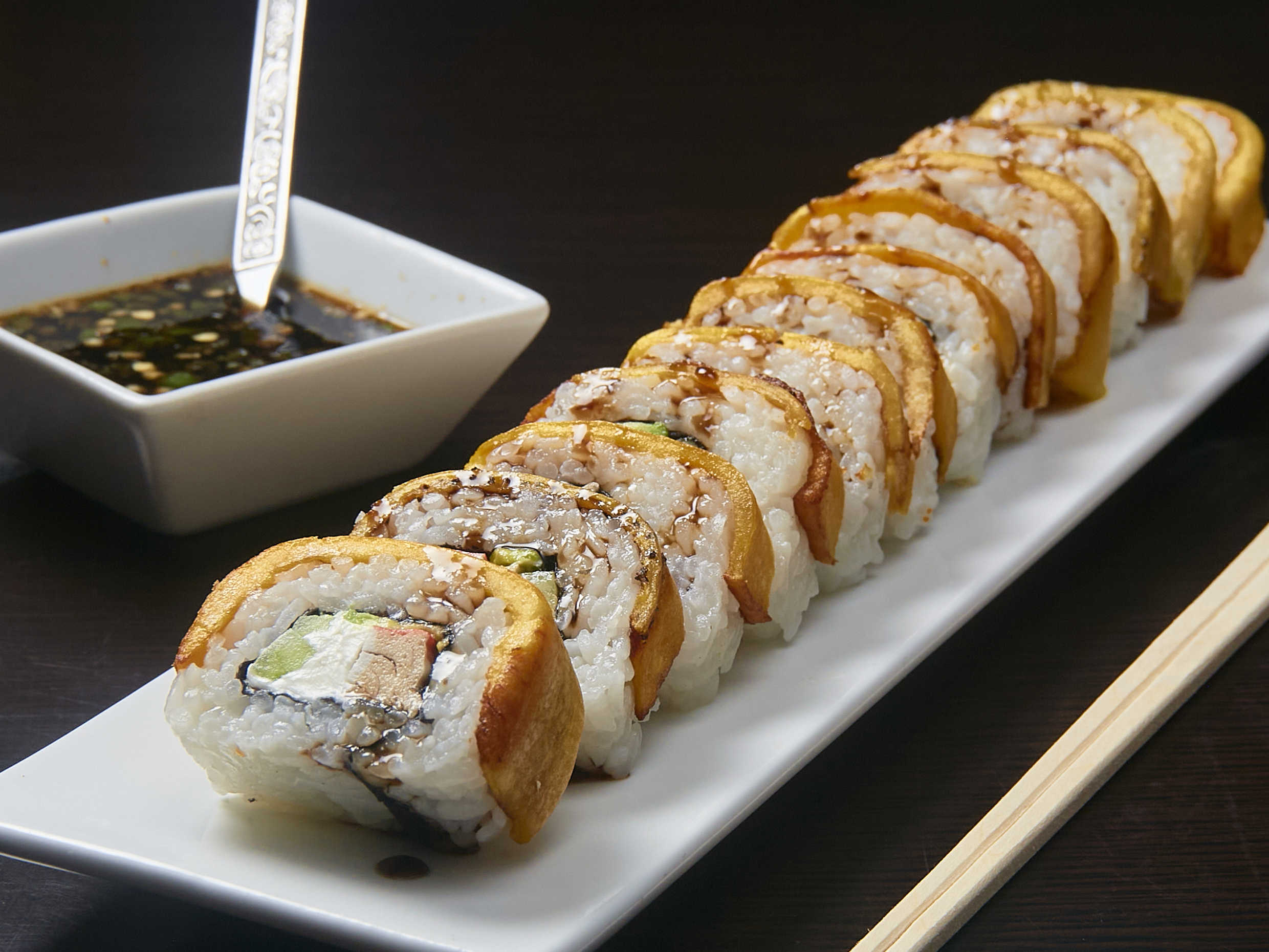 Plátano, salsa de anguila por fuera, relleno de surimi, queso, pepino y aguacate.