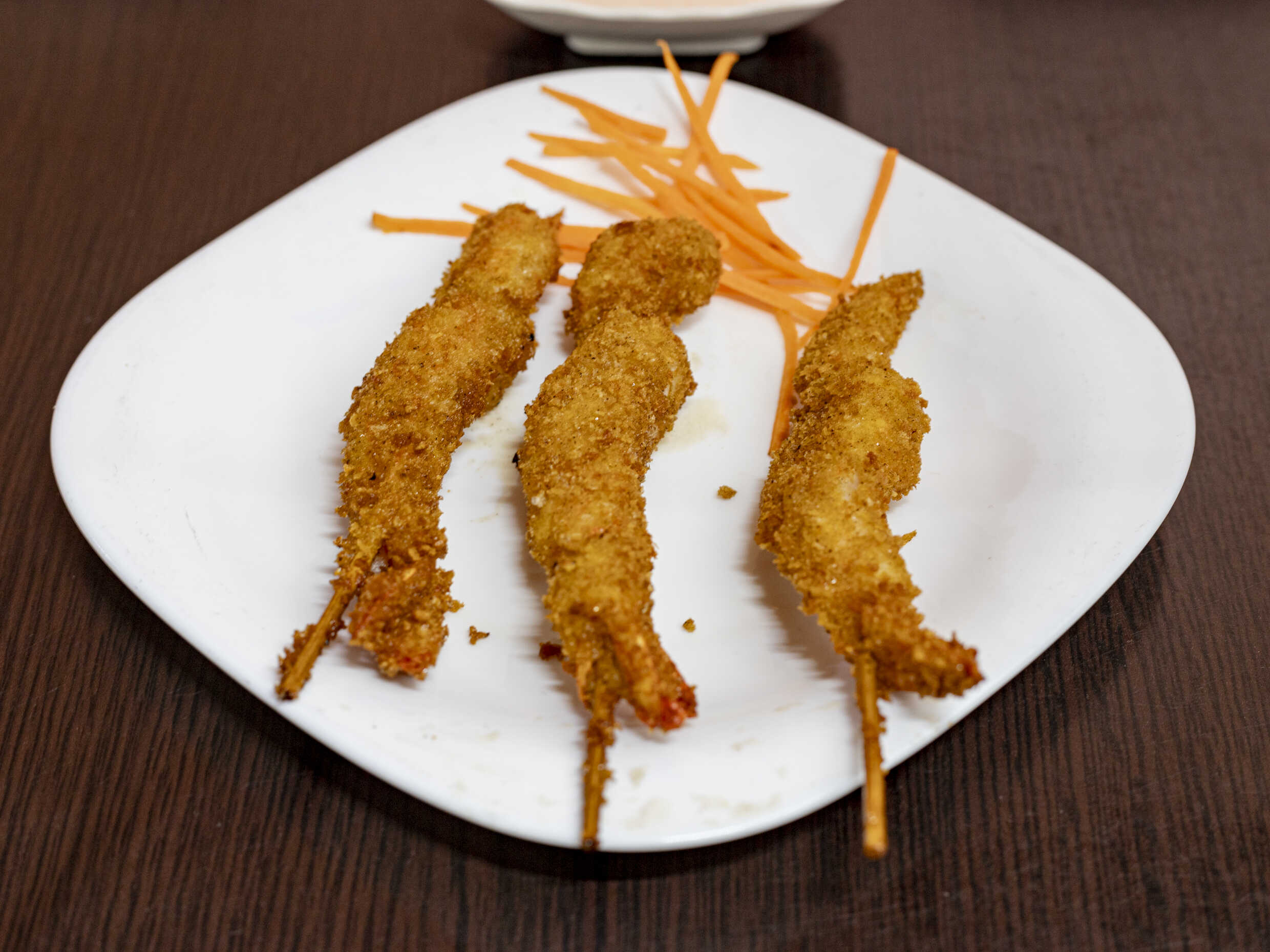 Tres brochetas de camaron empanizados y aderezo mil islas.