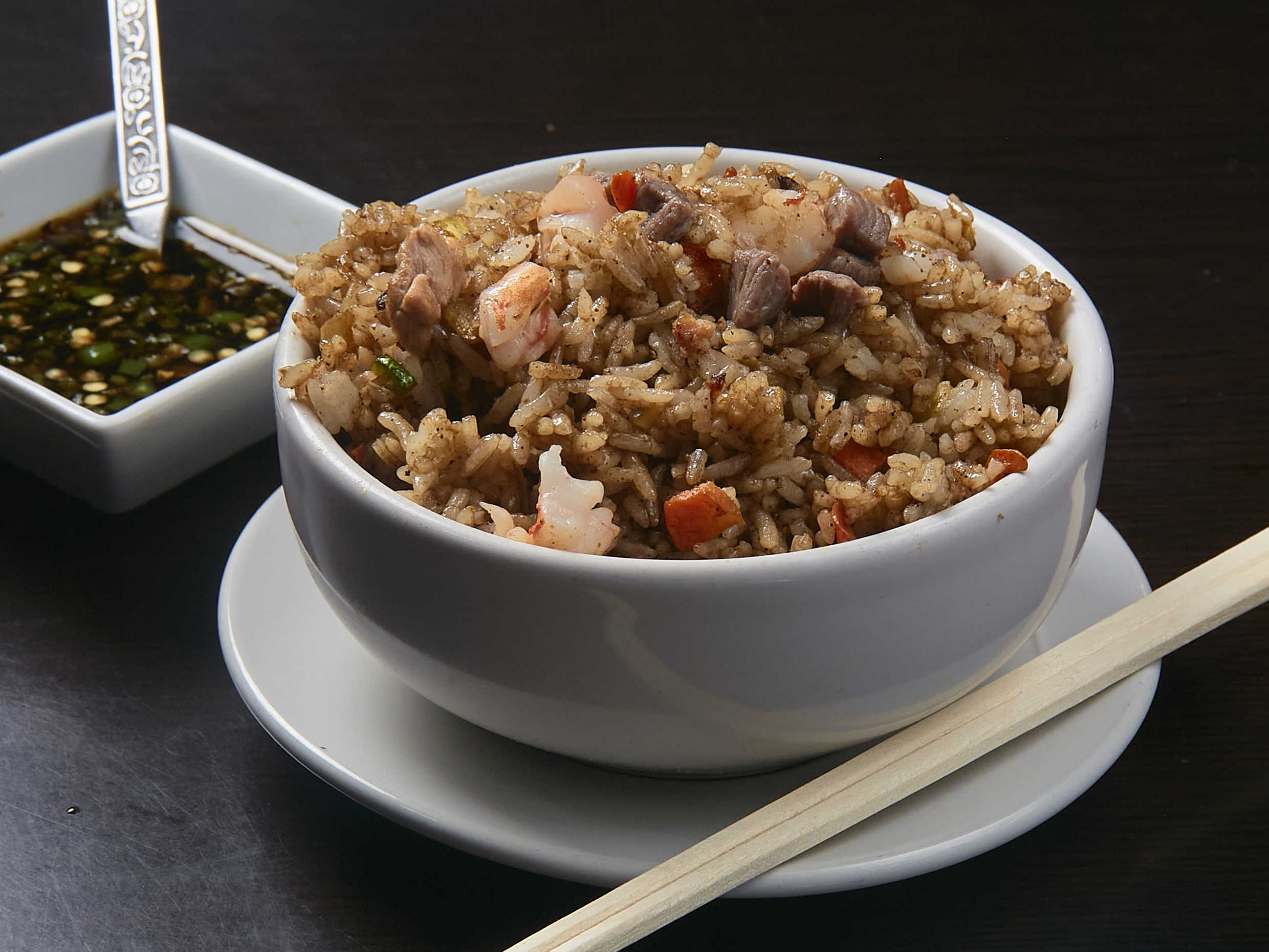 arroz frito con verduras, pollo, carne y salsa Tampico