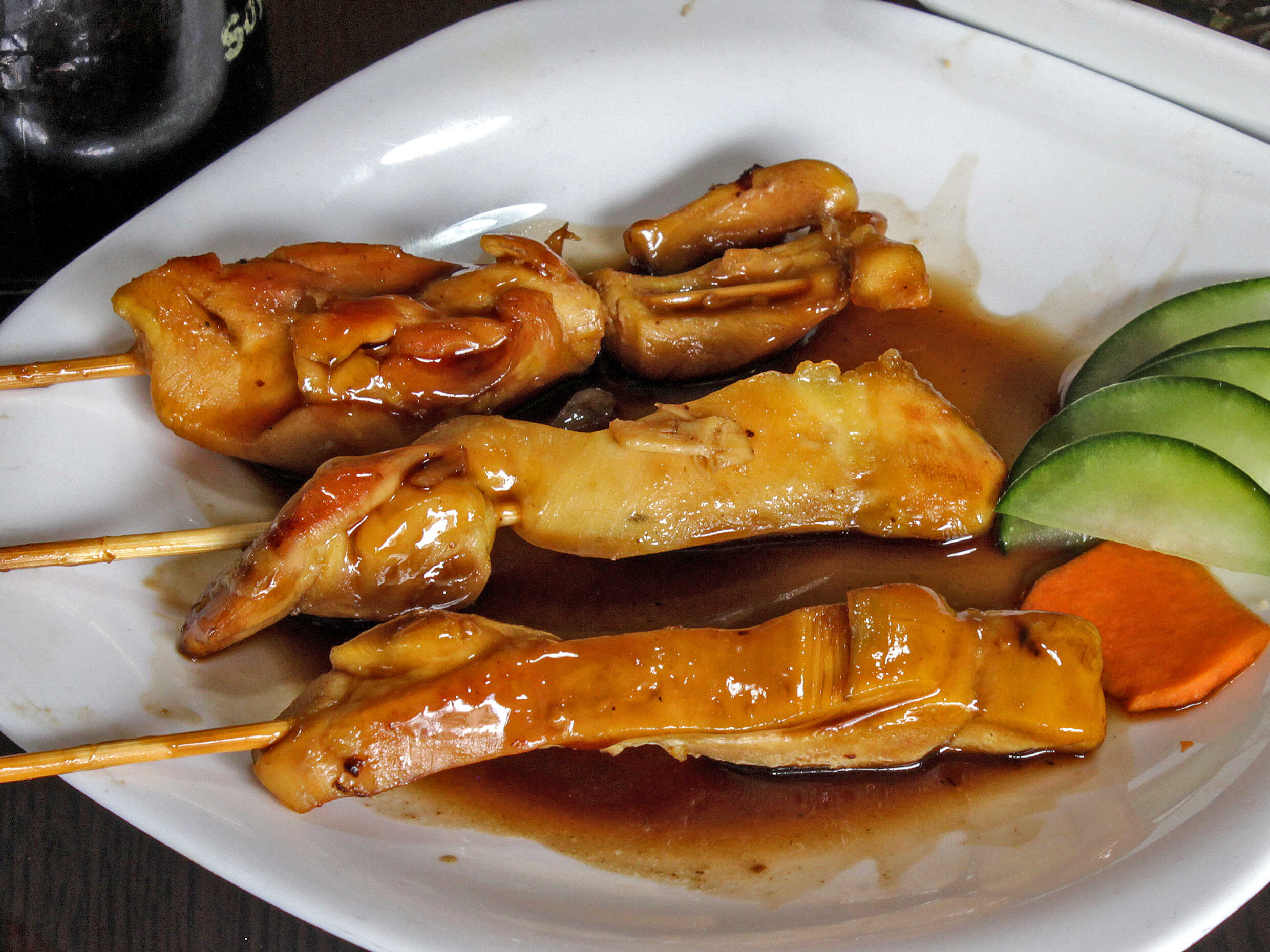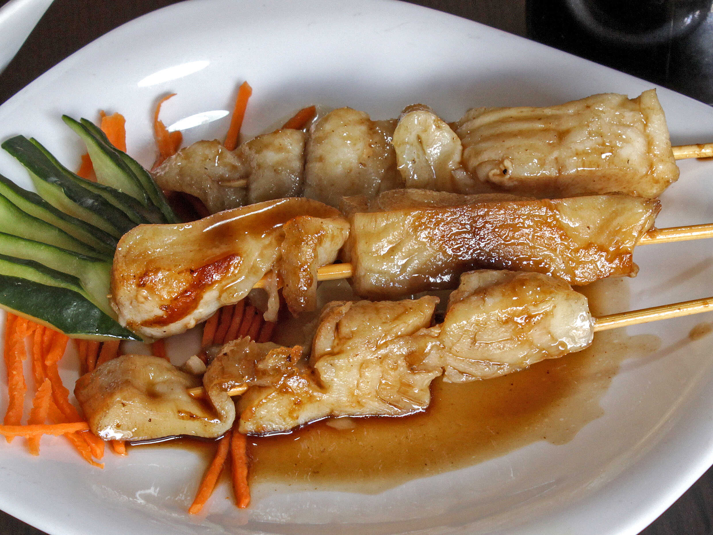 tres brochetas de pollo a la plancha en salsa teriyaki