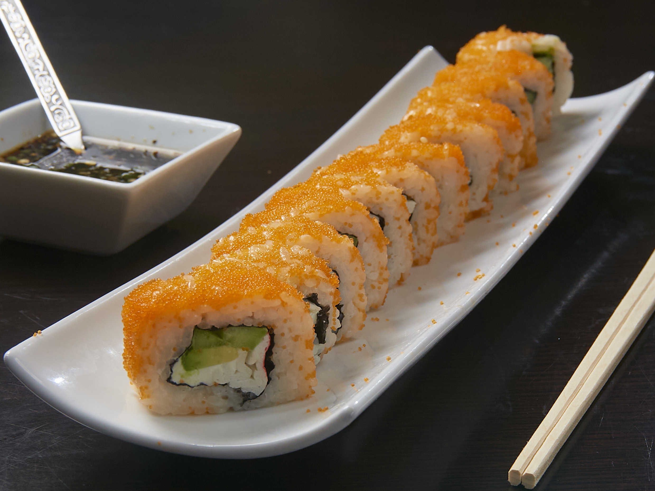 Masago por fuera relleno de camarón, queso, pepino y aguacate.