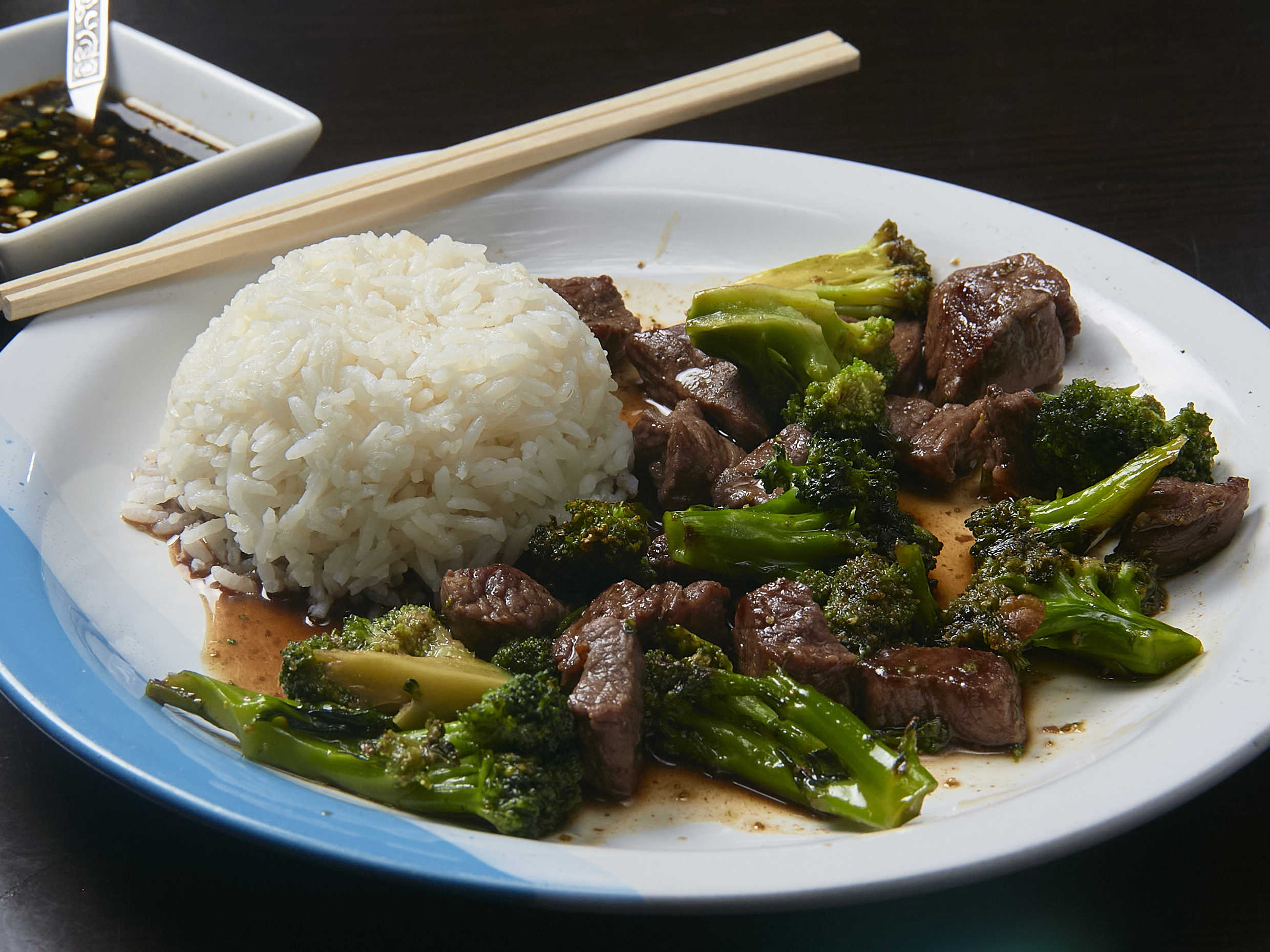 Arrachera en salsa teriyaki acompañados de brócoli y arroz al vapor