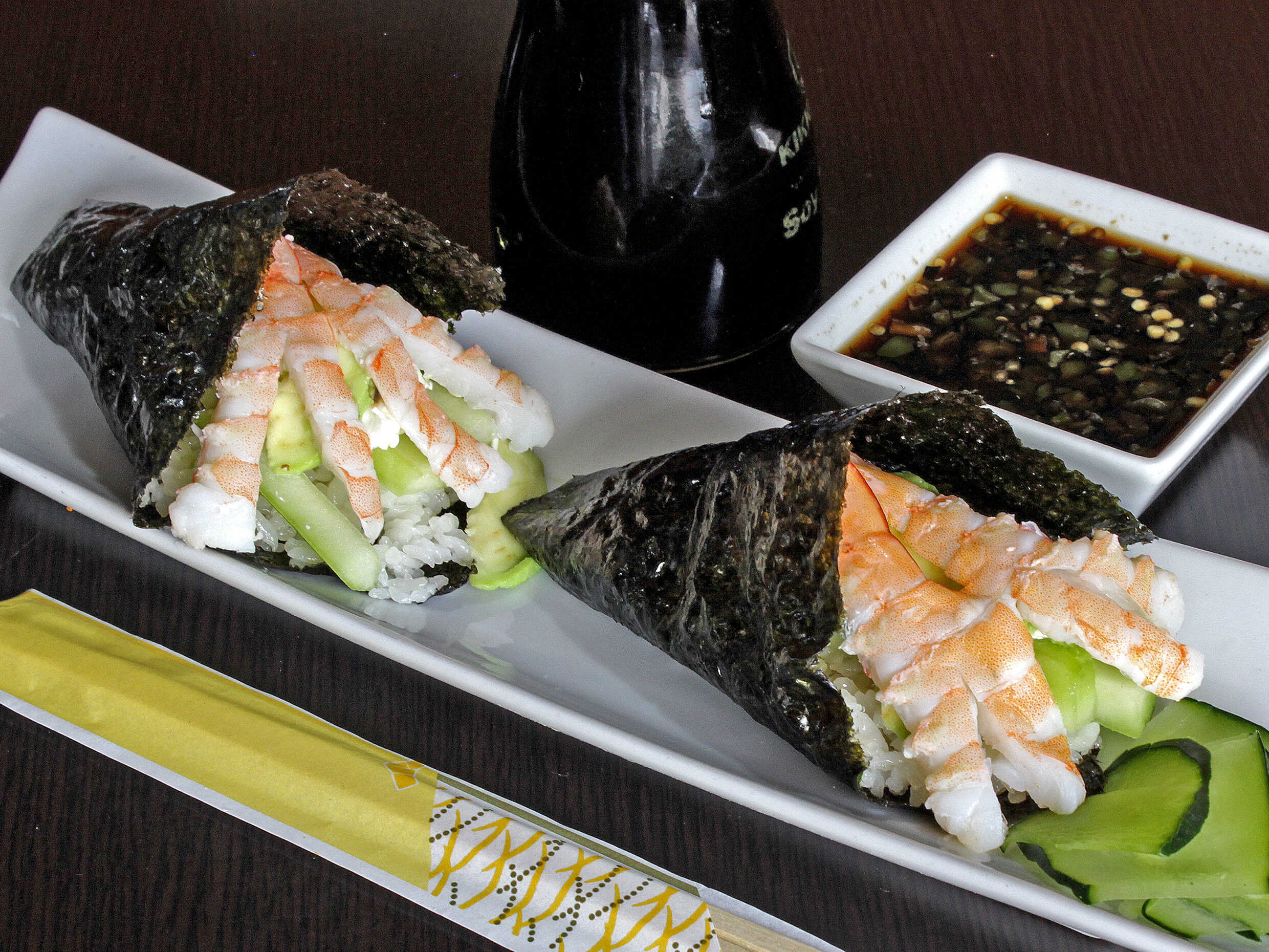 Cono de alga relleno de arroz, pepino, aguacate y salsa tampico.