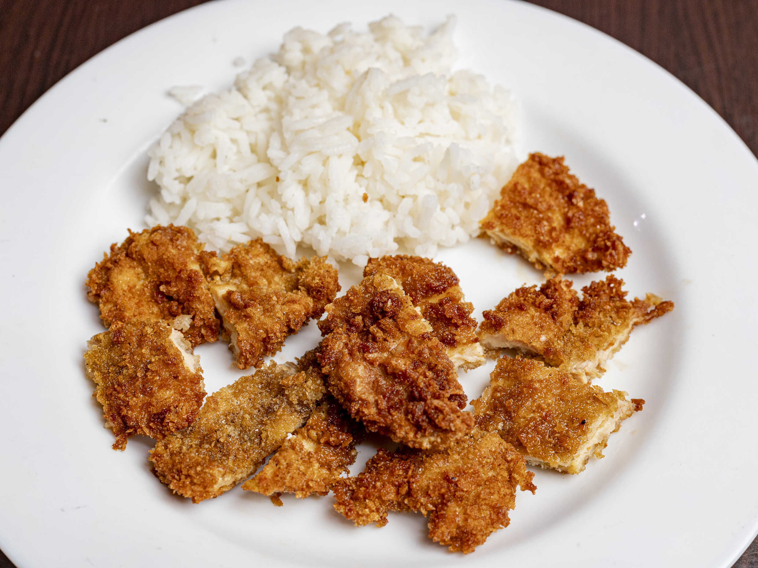 carne de cerdo empanizada sobre arroz al vapor