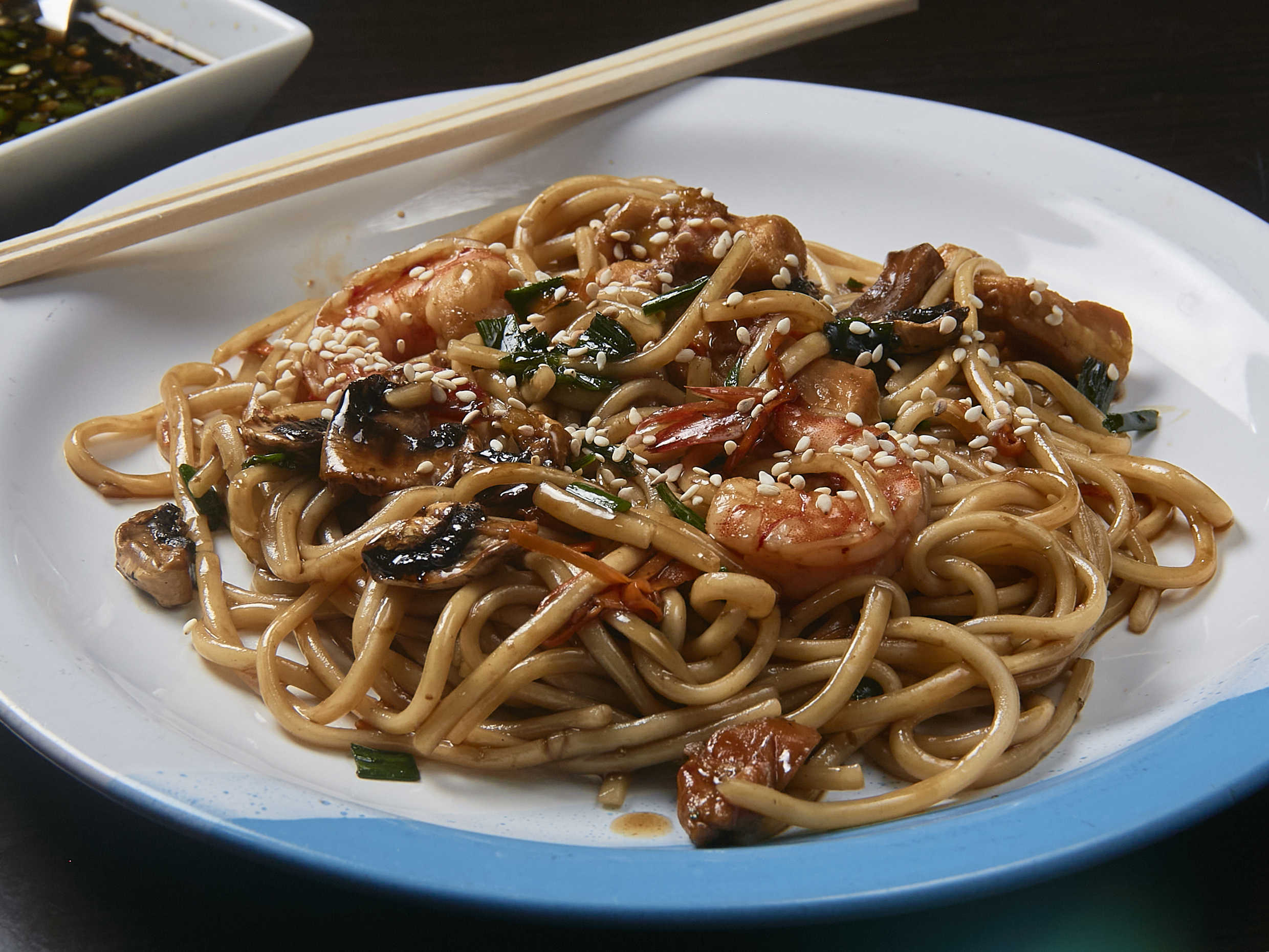 tallarines con camarón, pollo, champiñón y zanahoria fritos en salsa agridulce.