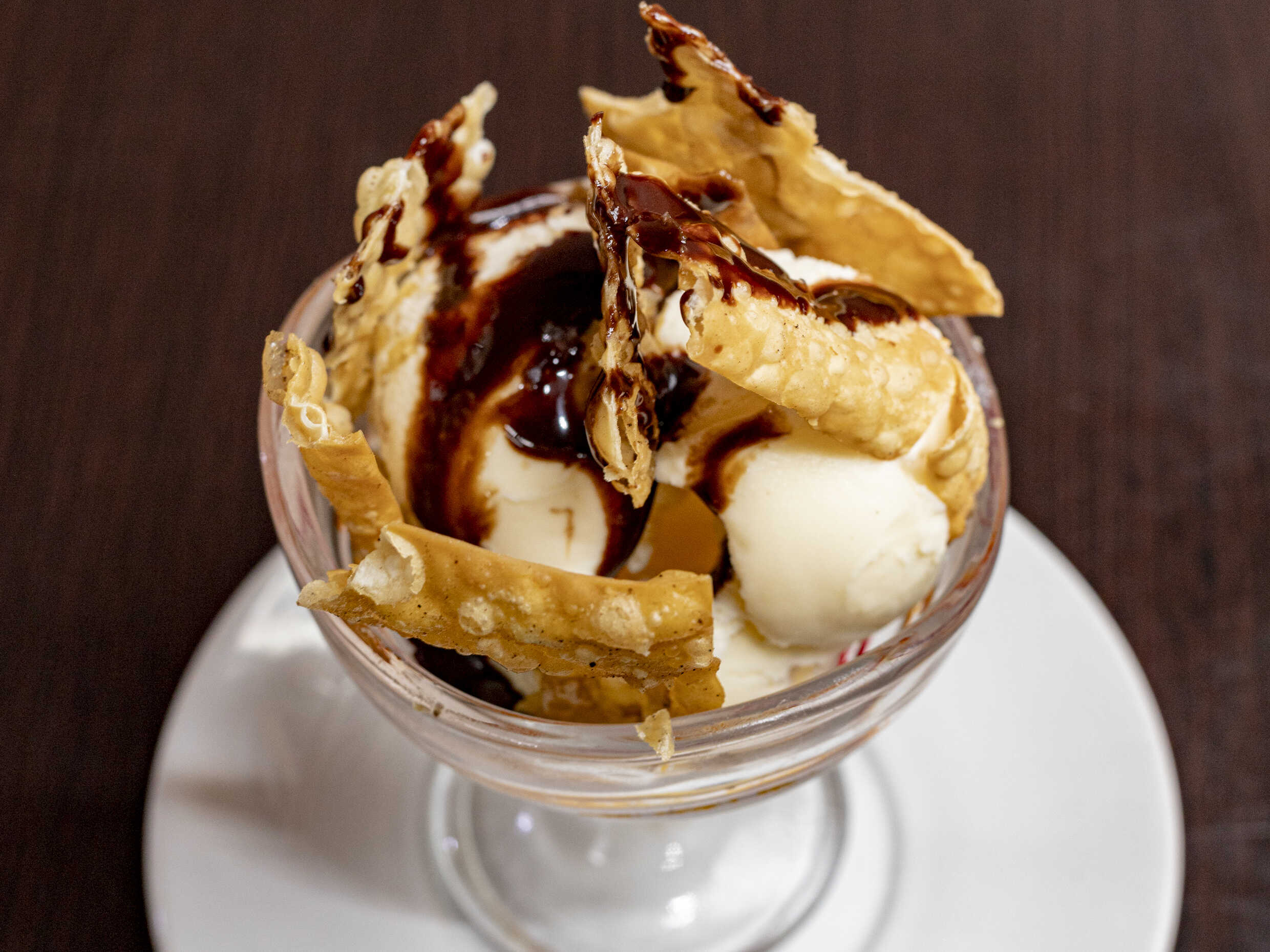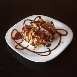 Helado de vainilla capeado con cubierta de fresa, cajeta o chocolate.