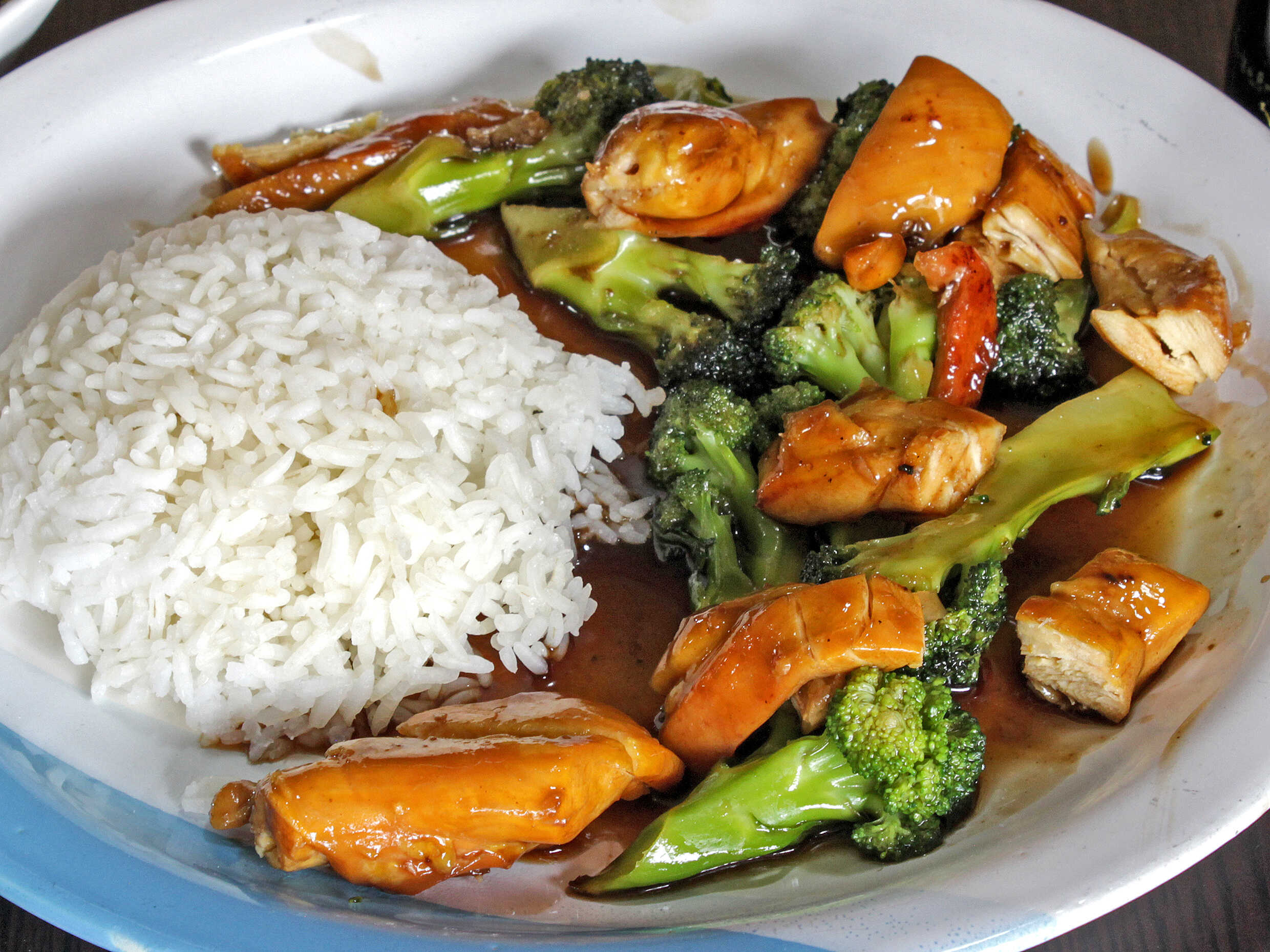 Pollo en salsa teriyaki acompañados de brócoli y arroz al vapor