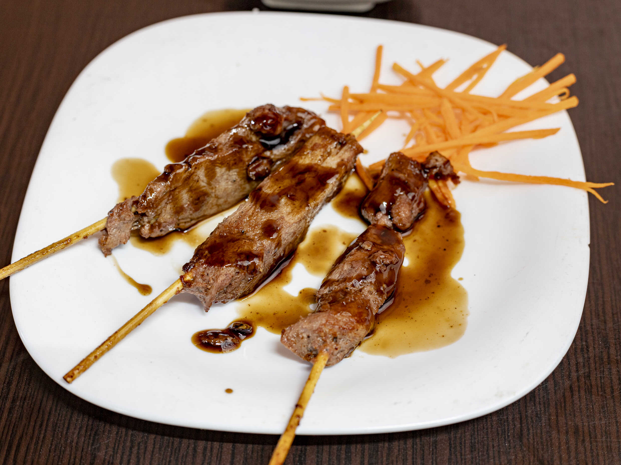tres brochetas de arrachera a la plancha en salsa teriyaki