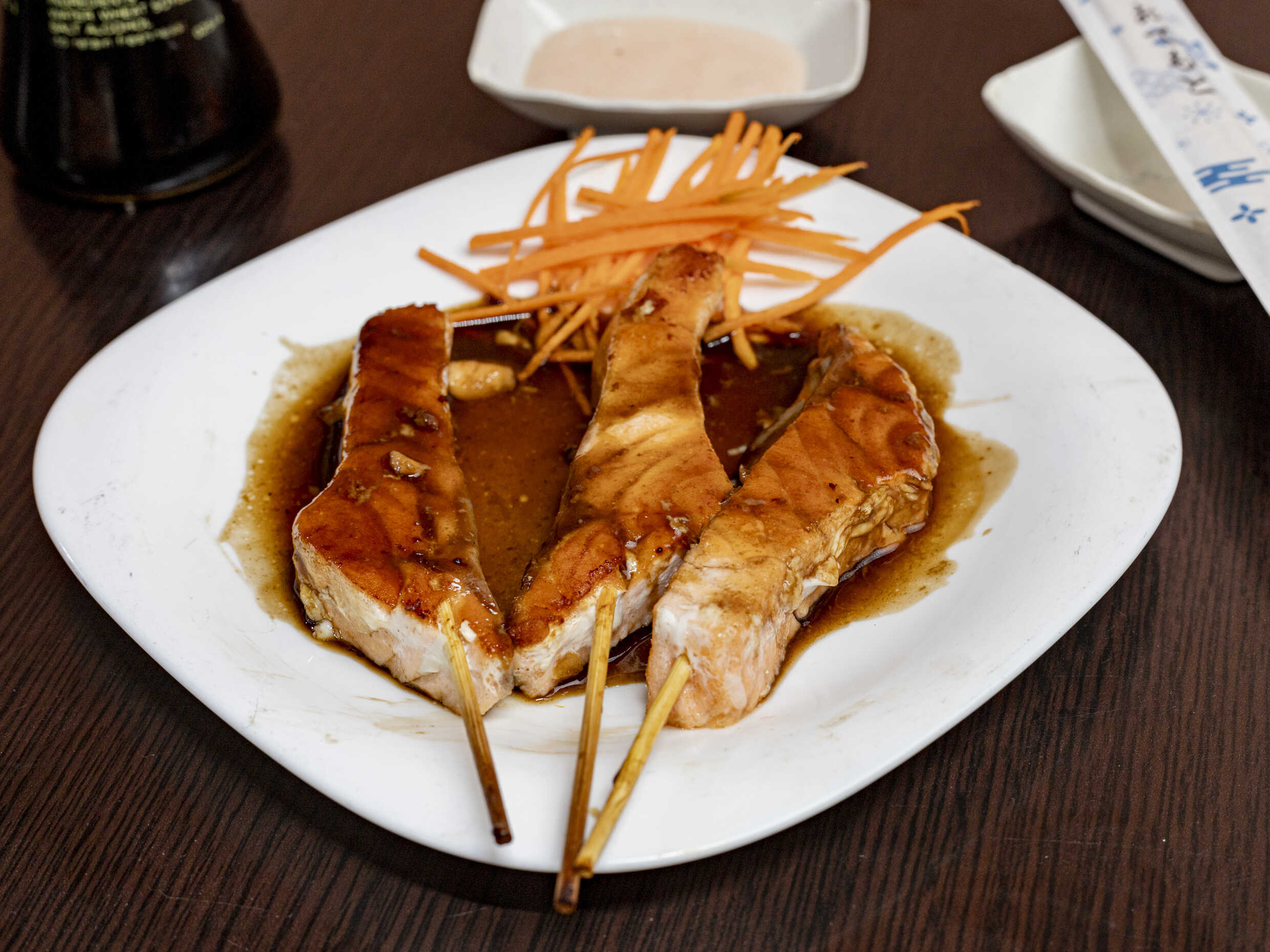 tres brochetas de salmon fresco a la plancha en salsa teriyaki