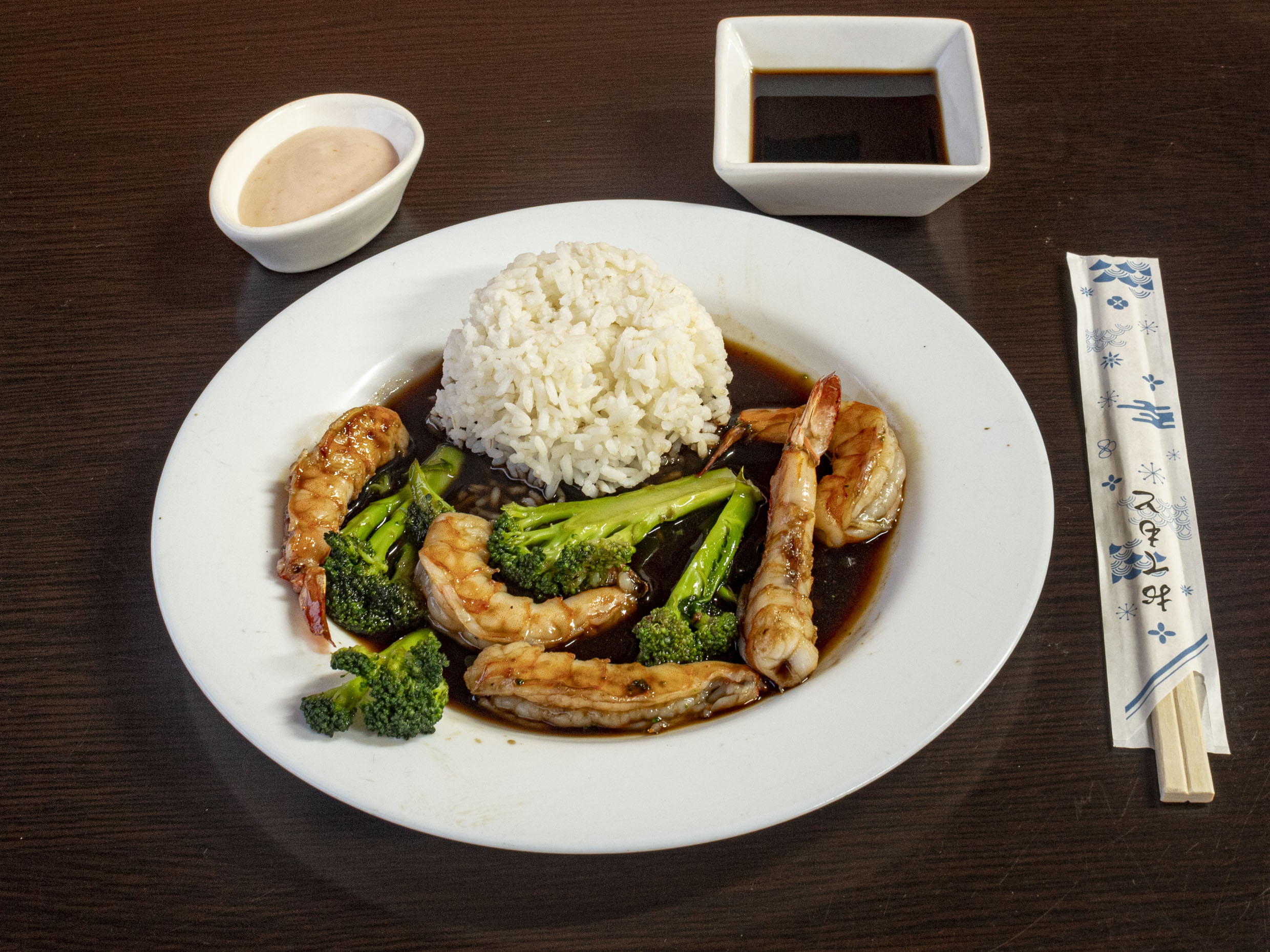 Camaron en salsa teriyaki acompañados de brócoli y arroz al vapor