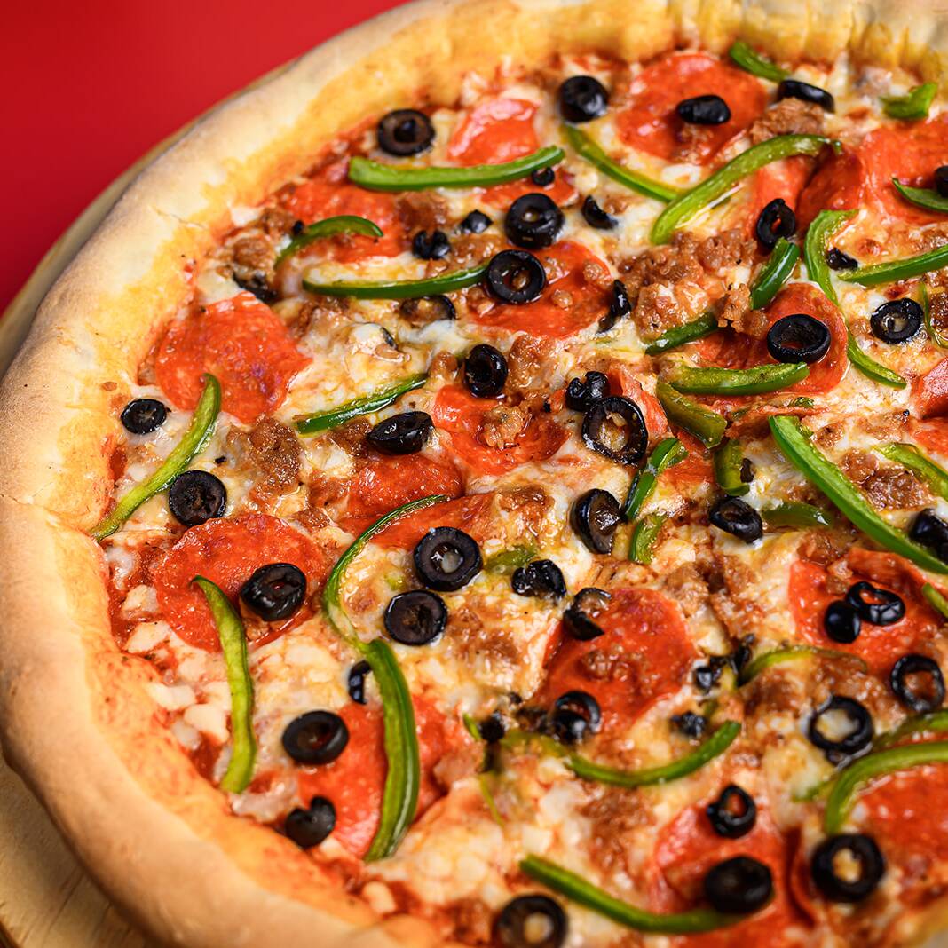 Un mix increíble: pepperoni, aceituna negra, salchicha italiana y pimiento verde.